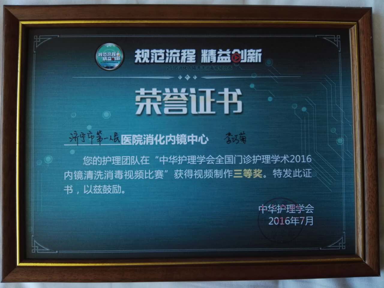 無痛內(nèi)鏡部在中華護理學(xué)會全國門診護理學(xué)術(shù)2016內(nèi)鏡清洗消毒視頻比賽三等獎