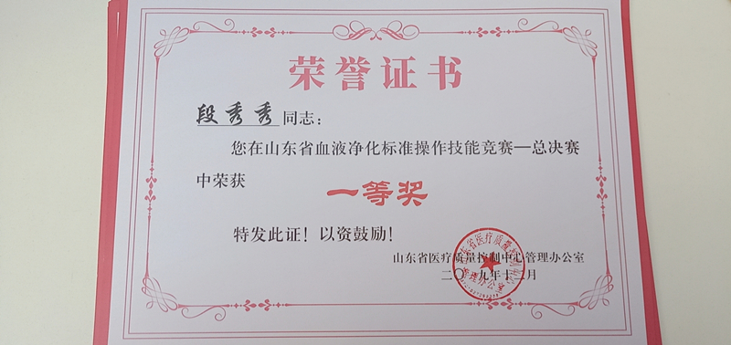 我院血液透析室護(hù)士段秀秀在山東省首屆血液凈化標(biāo)準(zhǔn)操作技能競(jìng)賽總決賽中,榮獲一等獎(jiǎng)(第一名)