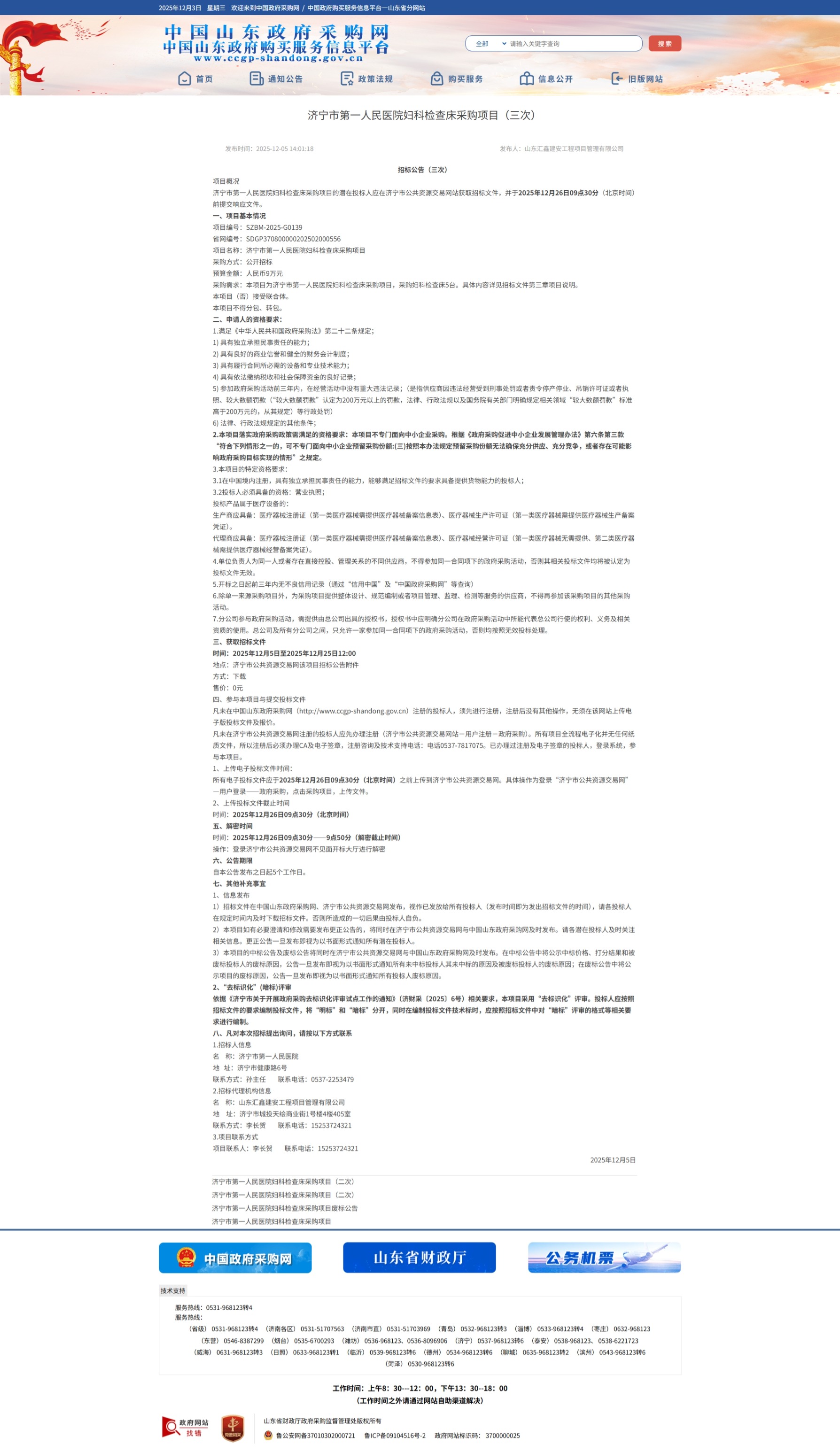 濟寧市第一人民醫(yī)院婦科檢查床采購項目(三次)招標公告