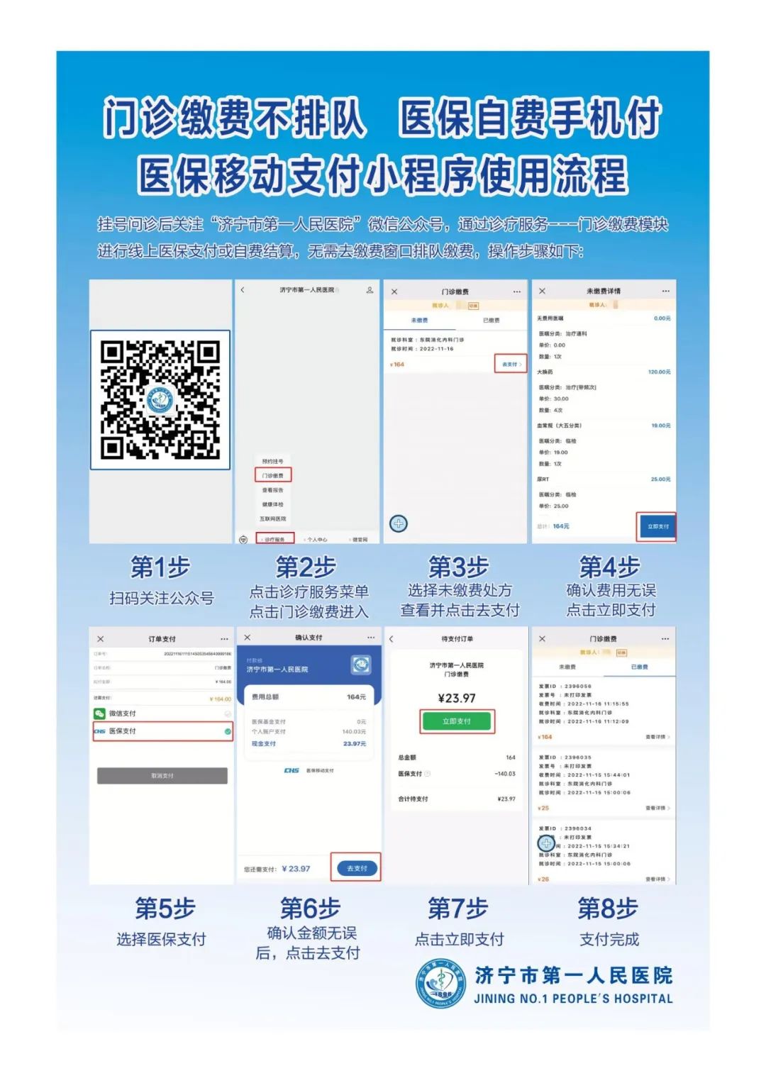 就診人只需微信關(guān)注“濟(jì)寧市第一人民醫(yī)院”微信公眾平臺,綁定個人信息即可通過手機(jī)隨地實(shí)時進(jìn)行處方醫(yī)保基金結(jié)算和個人自費(fèi)支付。醫(yī)保移動支付功能的開通,不僅節(jié)省了線下排隊(duì)繳費(fèi)的時間,也提高了醫(yī)保結(jié)算服務(wù)效率,改善了患者就醫(yī)體驗(yàn)。這一舉措實(shí)現(xiàn)了依托醫(yī)保電子憑證在醫(yī)院享受醫(yī)保服務(wù)“掌上辦”和“一站式結(jié)算”,切實(shí)滿足患者多元化的醫(yī)保就醫(yī)體驗(yàn),讓老百姓享受安全、高效、便捷的醫(yī)保線上服務(wù)。同時,在疫情處于常態(tài)化防控的當(dāng)下,“免排隊(duì)”、“免接觸”等優(yōu)勢也能保障群眾身體健康。就醫(yī)人通過“濟(jì)寧市第一人民醫(yī)院”微信公眾平臺跳轉(zhuǎn)醫(yī)保移動結(jié)算小程序就能完成線上醫(yī)保結(jié)算,看病更方便,更省時!